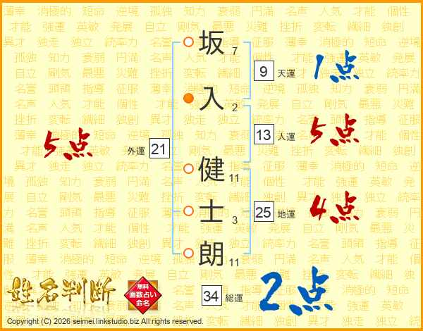 坂(7画)入(2画) 健(11画)士(3画)朗(11画)