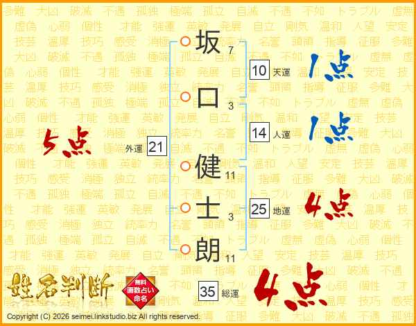 坂(7画)口(3画) 健(11画)士(3画)朗(11画)