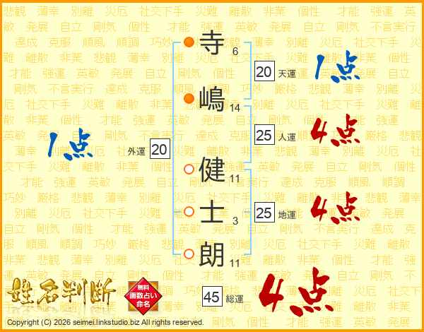 寺(6画)嶋(14画) 健(11画)士(3画)朗(11画)