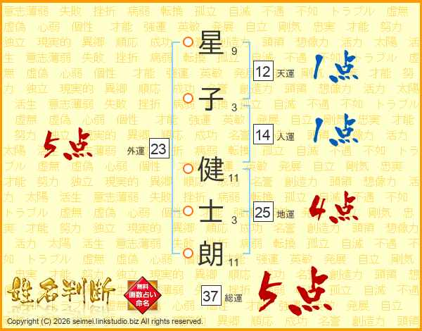 星(9画)子(3画) 健(11画)士(3画)朗(11画)