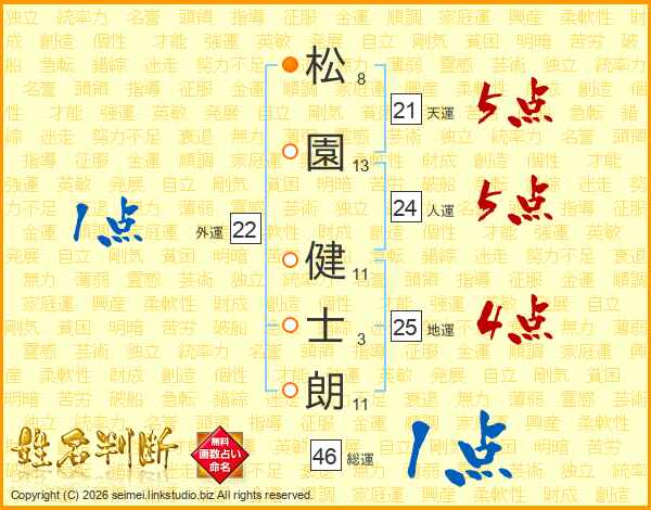 松(8画)園(13画) 健(11画)士(3画)朗(11画)