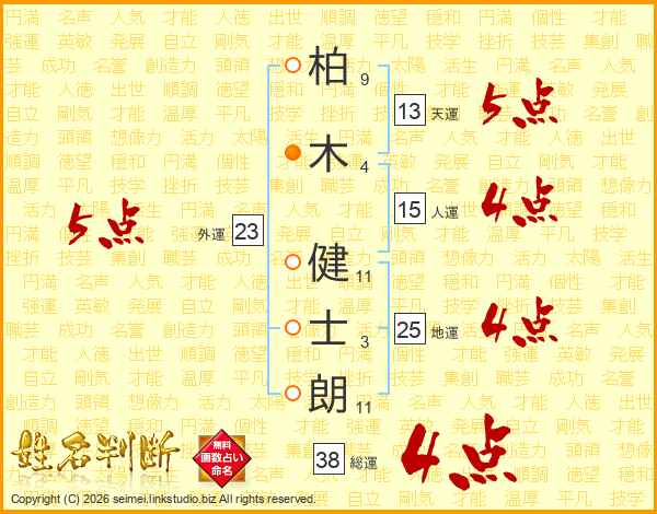 柏(9画)木(4画) 健(11画)士(3画)朗(11画)