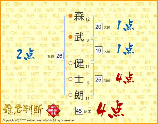 森(12画)武(8画) 健(11画)士(3画)朗(11画)