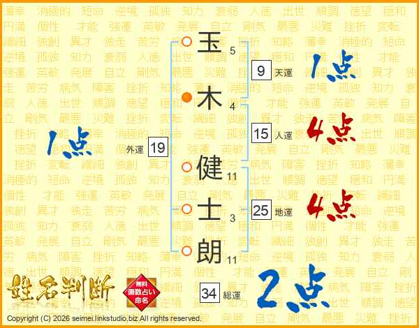 玉(5画)木(4画) 健(11画)士(3画)朗(11画)