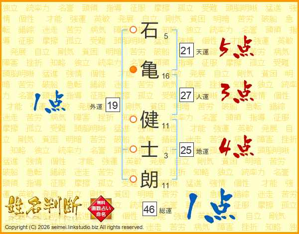 石(5画)亀(16画) 健(11画)士(3画)朗(11画)