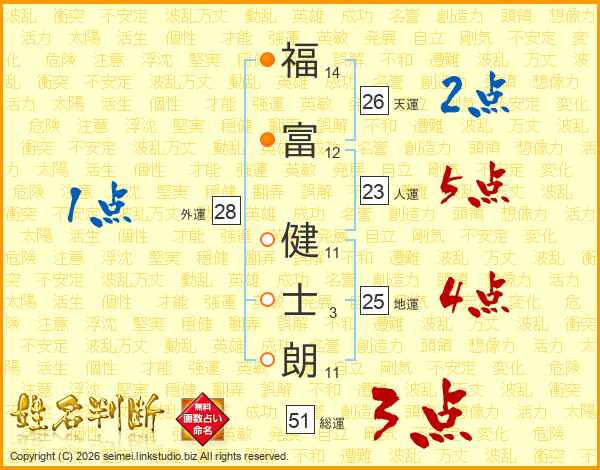 福(14画)富(12画) 健(11画)士(3画)朗(11画)