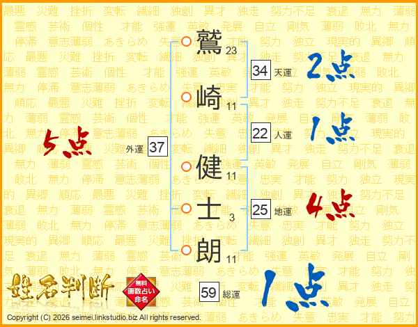 鷲(23画)崎(11画) 健(11画)士(3画)朗(11画)