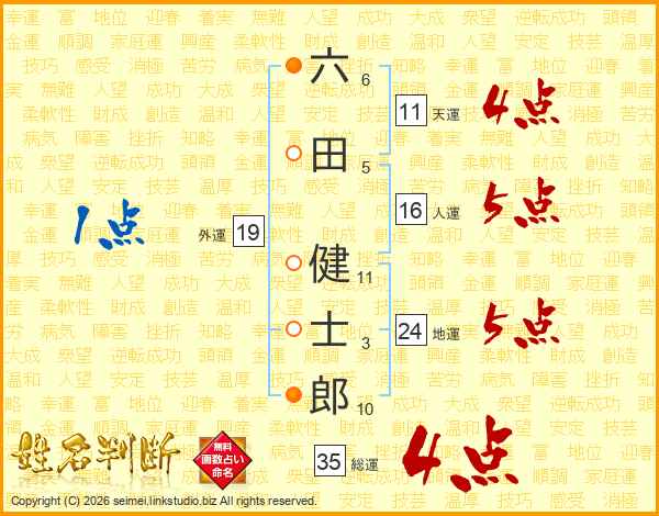 六(6画)田(5画) 健(11画)士(3画)郎(10画)