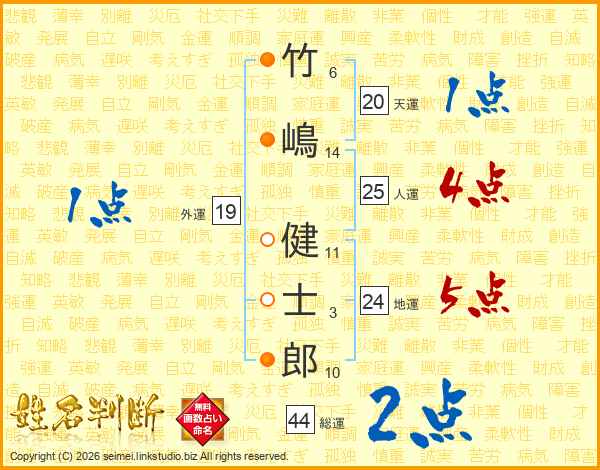 竹(6画)嶋(14画) 健(11画)士(3画)郎(10画)