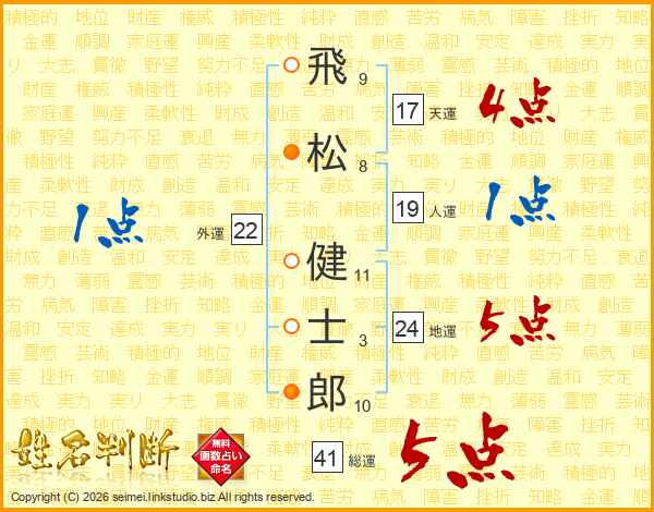 飛(9画)松(8画) 健(11画)士(3画)郎(10画)