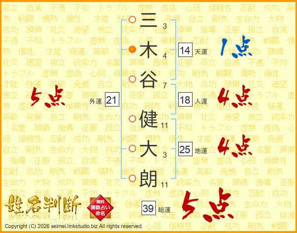 三(3画)木(4画)谷(7画) 健(11画)大(3画)朗(11画)