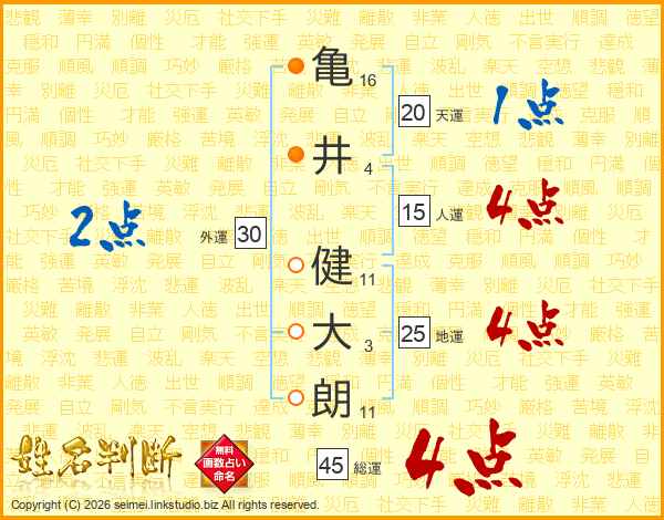 亀(16画)井(4画) 健(11画)大(3画)朗(11画)