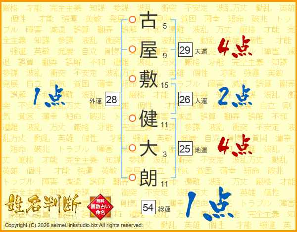 古(5画)屋(9画)敷(15画) 健(11画)大(3画)朗(11画)