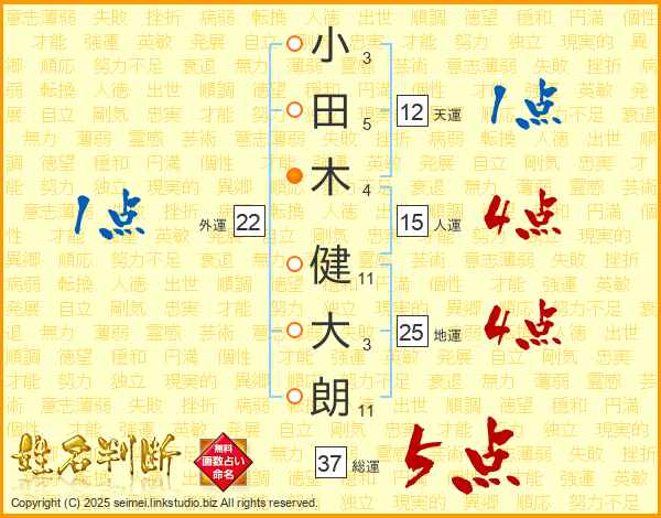 小(3画)田(5画)木(4画) 健(11画)大(3画)朗(11画)