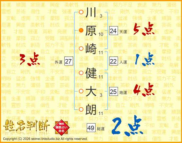 川(3画)原(10画)崎(11画) 健(11画)大(3画)朗(11画)