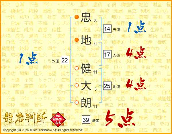 忠(8画)地(6画) 健(11画)大(3画)朗(11画)