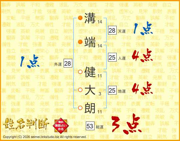 溝(14画)端(14画) 健(11画)大(3画)朗(11画)