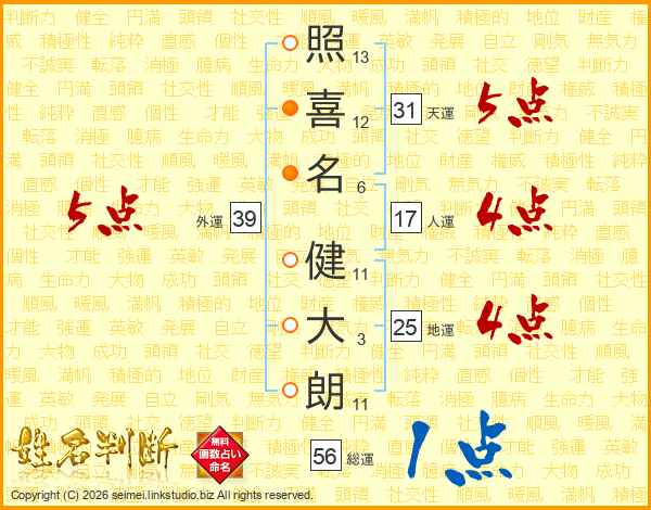 照(13画)喜(12画)名(6画) 健(11画)大(3画)朗(11画)