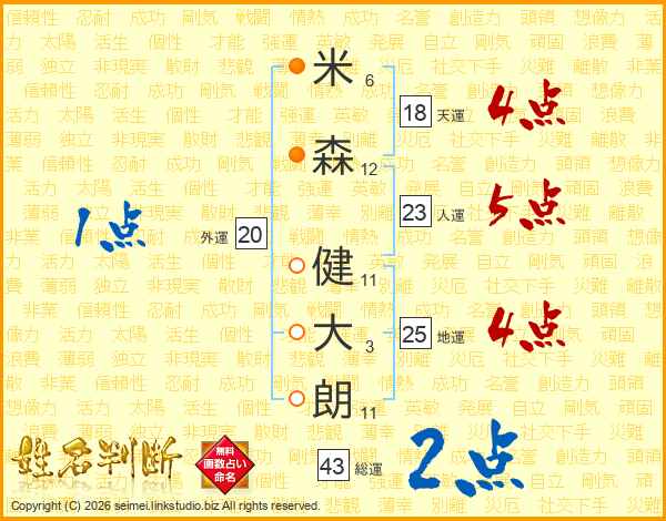米(6画)森(12画) 健(11画)大(3画)朗(11画)