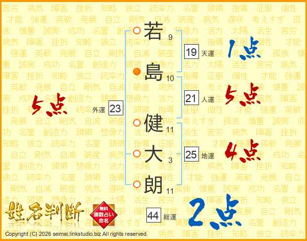 若(9画)島(10画) 健(11画)大(3画)朗(11画)
