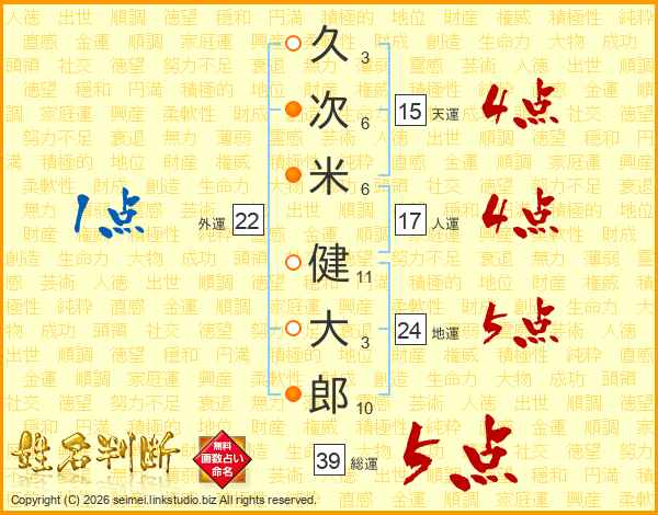 久(3画)次(6画)米(6画) 健(11画)大(3画)郎(10画)
