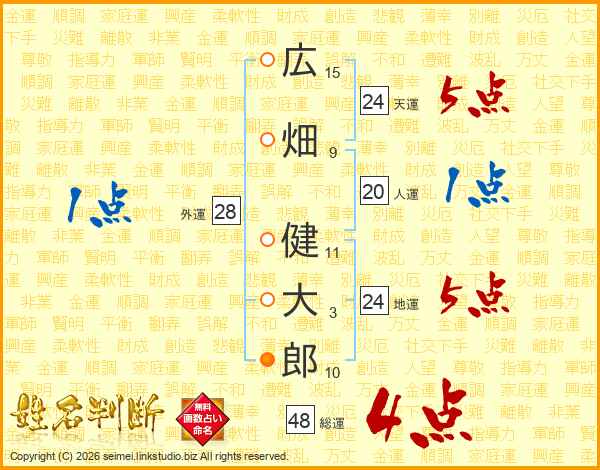 広(15画)畑(9画) 健(11画)大(3画)郎(10画)