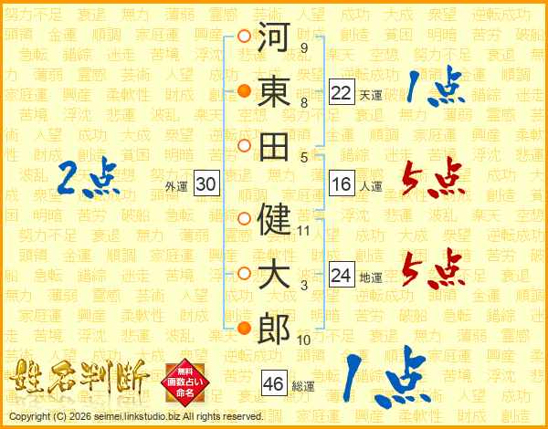 河(9画)東(8画)田(5画) 健(11画)大(3画)郎(10画)