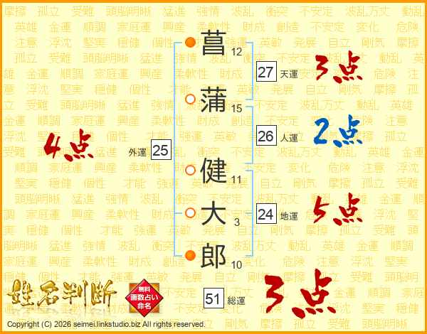 菖(12画)蒲(15画) 健(11画)大(3画)郎(10画)