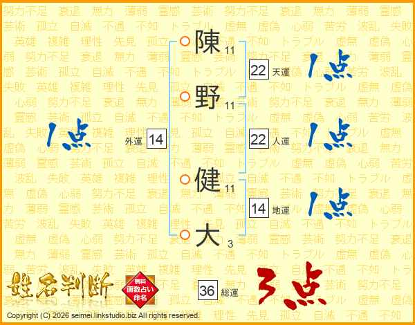 陳(11画)野(11画) 健(11画)大(3画)