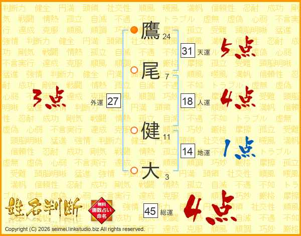 鷹尾健大さんの総運は45画の4点!