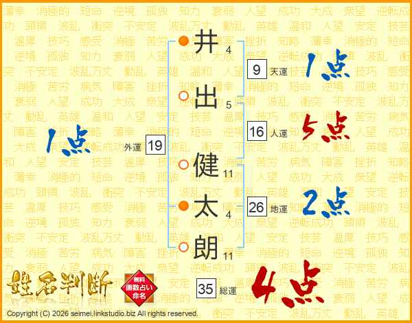 井(4画)出(5画) 健(11画)太(4画)朗(11画)