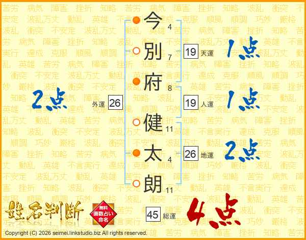 今(4画)別(7画)府(8画) 健(11画)太(4画)朗(11画)