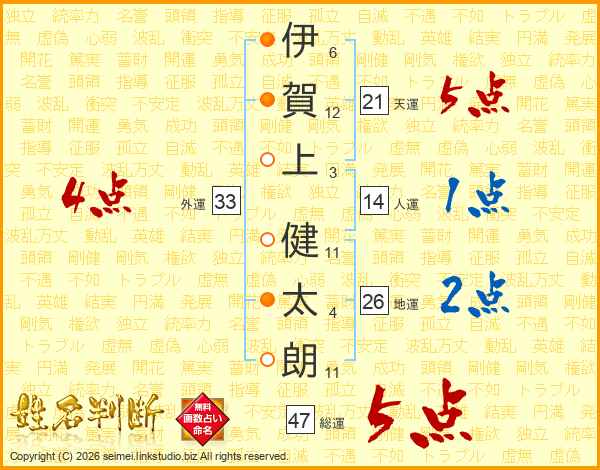 伊(6画)賀(12画)上(3画) 健(11画)太(4画)朗(11画)