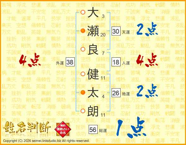 大(3画)瀬(20画)良(7画) 健(11画)太(4画)朗(11画)