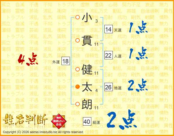 小(3画)貫(11画) 健(11画)太(4画)朗(11画)