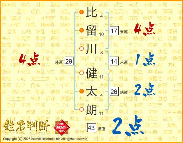 比(4画)留(10画)川(3画) 健(11画)太(4画)朗(11画)