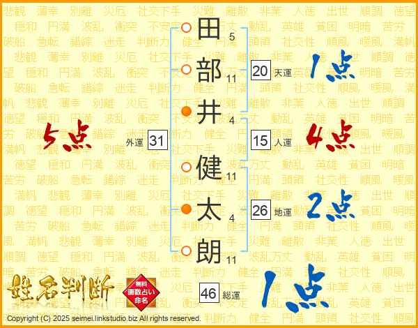 田(5画)部(11画)井(4画) 健(11画)太(4画)朗(11画)