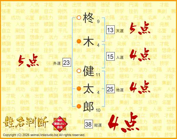 柊木健太郎さんの総運は38画の4点!