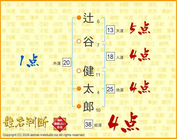 辻(6画)谷(7画) 健(11画)太(4画)郎(10画)