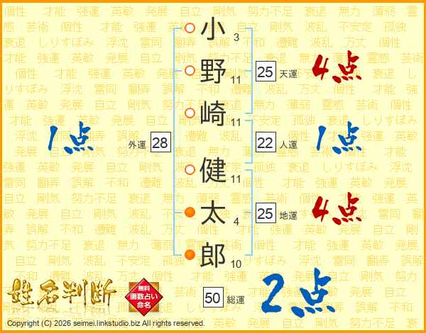 小(3画)野(11画)崎(11画) 健(11画)太(4画)郎(10画)