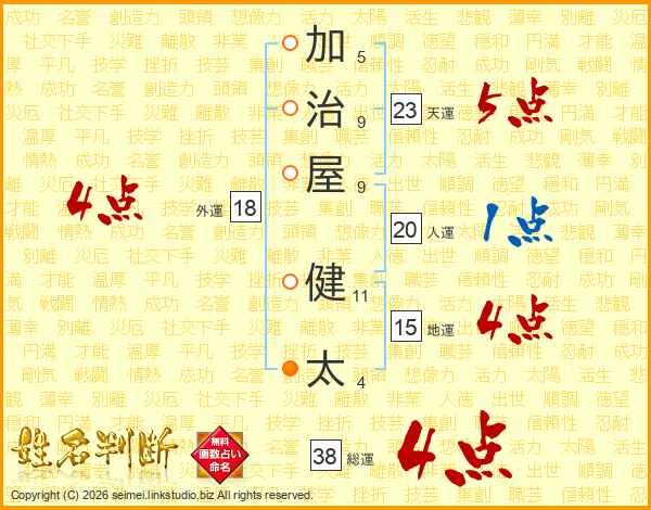 加(5画)治(9画)屋(9画) 健(11画)太(4画)