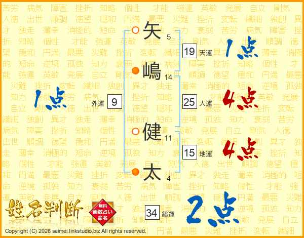 矢(5画)嶋(14画) 健(11画)太(4画)