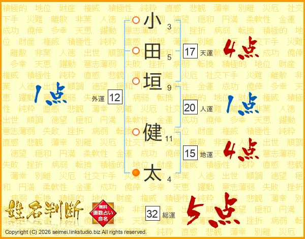 小田垣健太さんの総運は32画の5点!