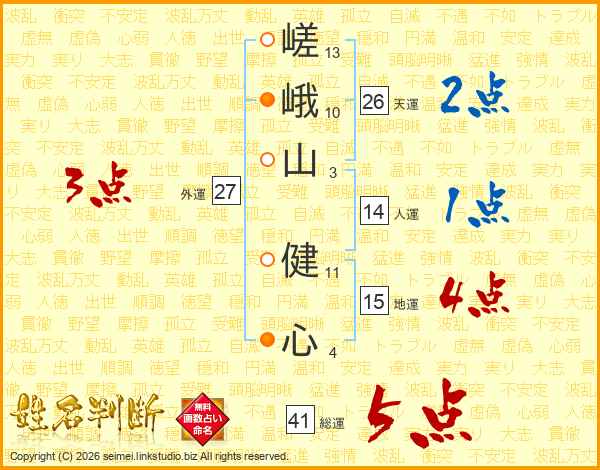 嵯(13画)峨(10画)山(3画) 健(11画)心(4画)