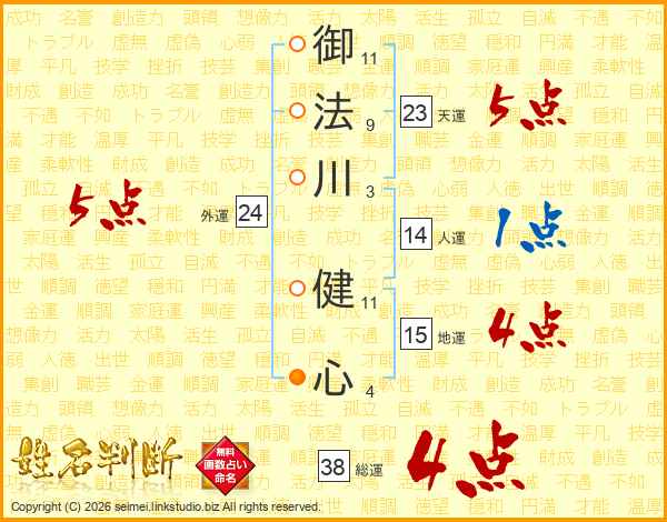 御(11画)法(9画)川(3画) 健(11画)心(4画)