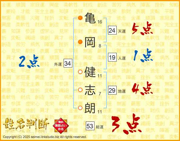 亀(16画)岡(8画) 健(11画)志(7画)朗(11画)