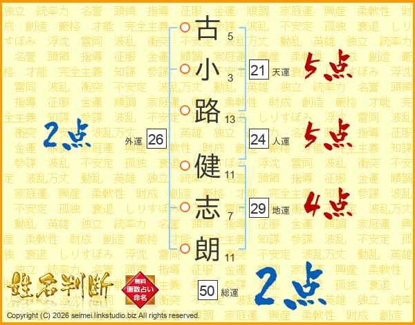 古(5画)小(3画)路(13画) 健(11画)志(7画)朗(11画)
