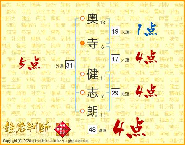 奥(13画)寺(6画) 健(11画)志(7画)朗(11画)