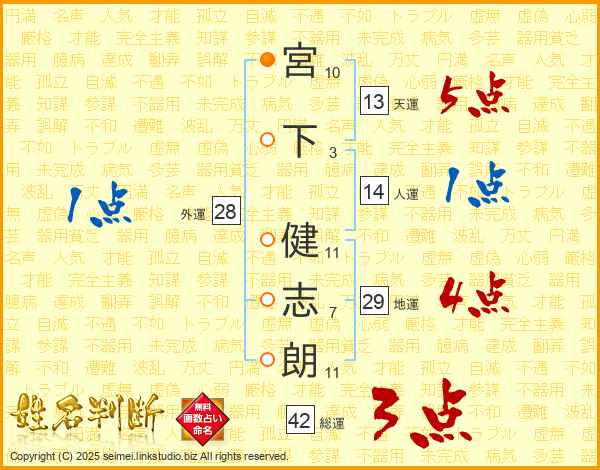 宮(10画)下(3画) 健(11画)志(7画)朗(11画)