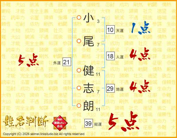 小(3画)尾(7画) 健(11画)志(7画)朗(11画)
